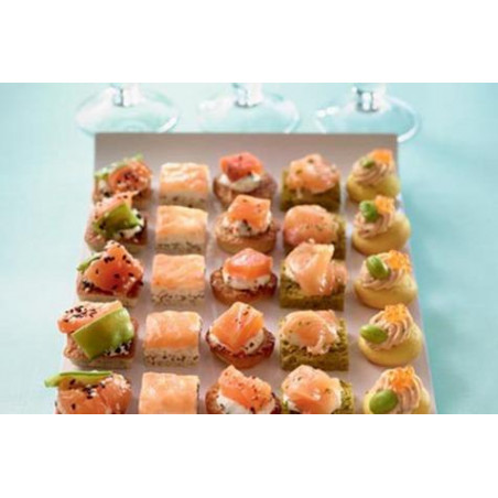 Assortiment de 35 pièces de canapés au saumon sous toute ses formes : mariné , fumé , mi cuit ....