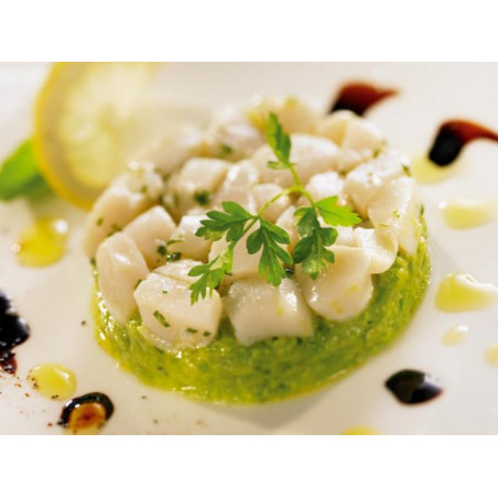 Tartare de Saint Jacques , huile d'olive et jus de citron sur une crème de pois à la menthe