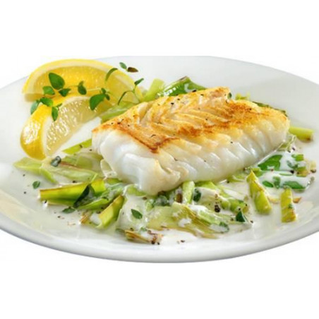 Filet de merlu cuit sous vide à basse température dans une délicate sauce poireau , champignon de Paris
