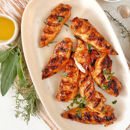 Aiguillettes de poulet marinées dans une sauce barbecue à base de concentré de tomates, vinaigre de cidre, paprika fumé, oignons, poivre et piment de cayenne.Saveurs subtilement fumées du barbecue