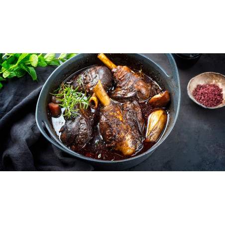 Jarret d'agneau avec os, longuement confit dans son jus au thym, sel, poivre et vin blanc. A la texture idéale et aux arômes délicats.