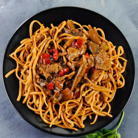 Barquette de boeuf sauté sauce kyoto , accompagné de nouilles